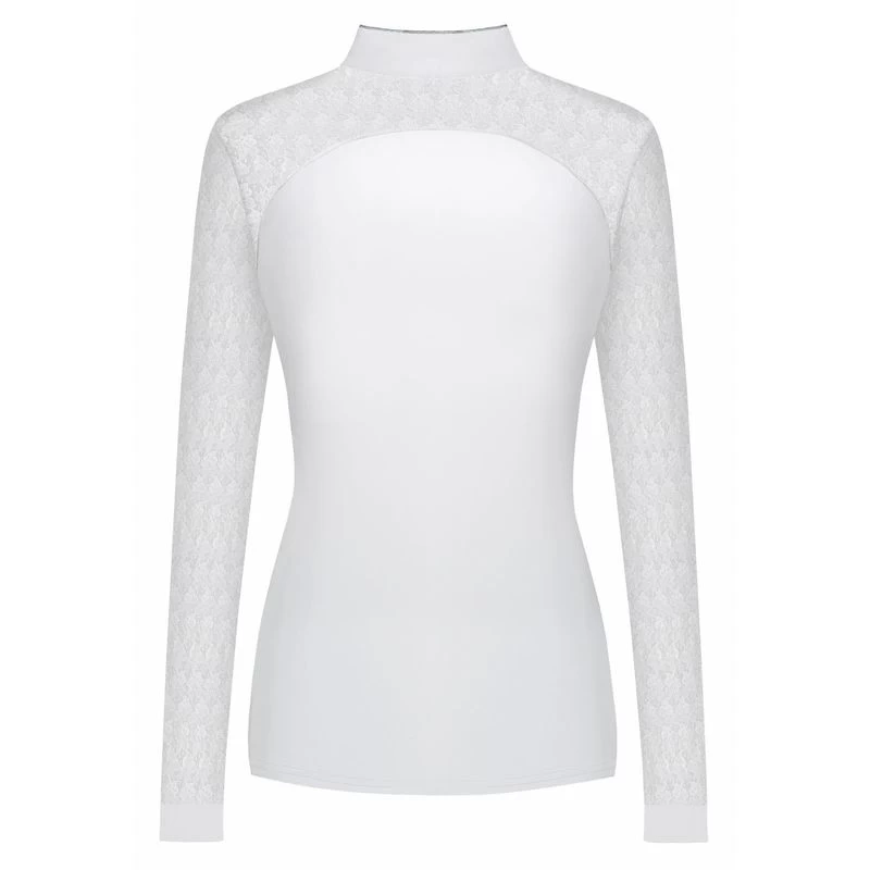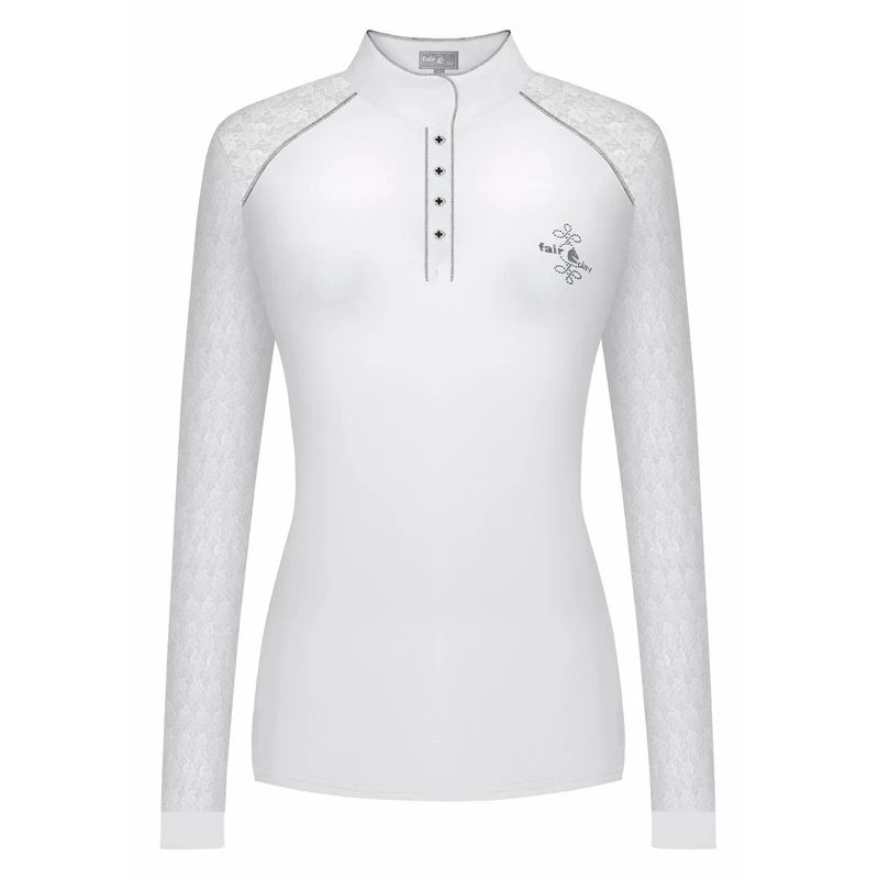 This feminine, sporty show shirt is made of a stretchy recycled technical fabric that is breathable and moisture wicking. It has stretch lace inserts on the shoulders that add both comfort and style to the shirt. The tab collar is fastened with decorative buttons on a front placket, and is decorated with shimmering piping. There is a Fair Play logo with crystals.