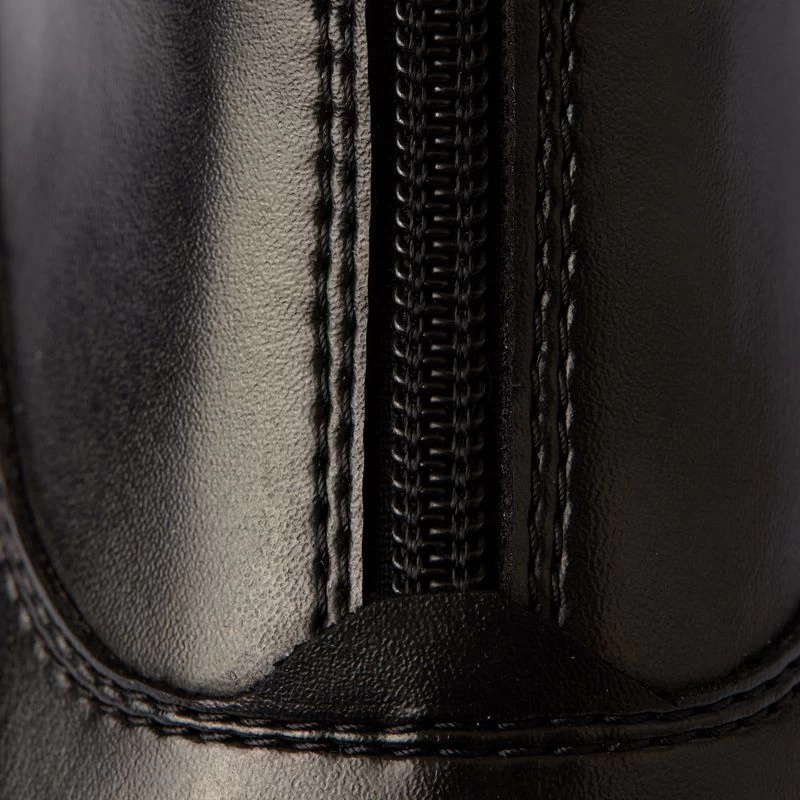 The paddock boots are made from soft, synthetic leather. A front zipper and elastic side panels make them easy to put on and take off. The durable sole keeps you safe in stirrups. Combine them with half chaps for a riding boot look.