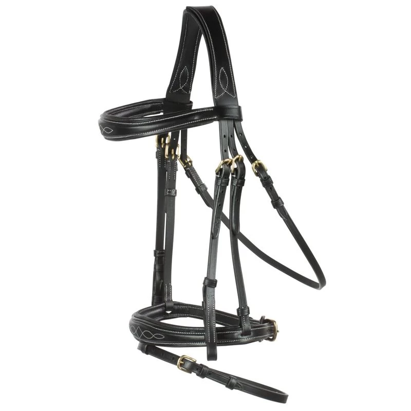 This elegant bridle features decorative stitching at noseband and browband. The soft allover padding makes is comfortable on your horse’s head. Rubberised reins make sure you don’t lose your grip. Brass fittings give this bridle the perfect finishing touch.