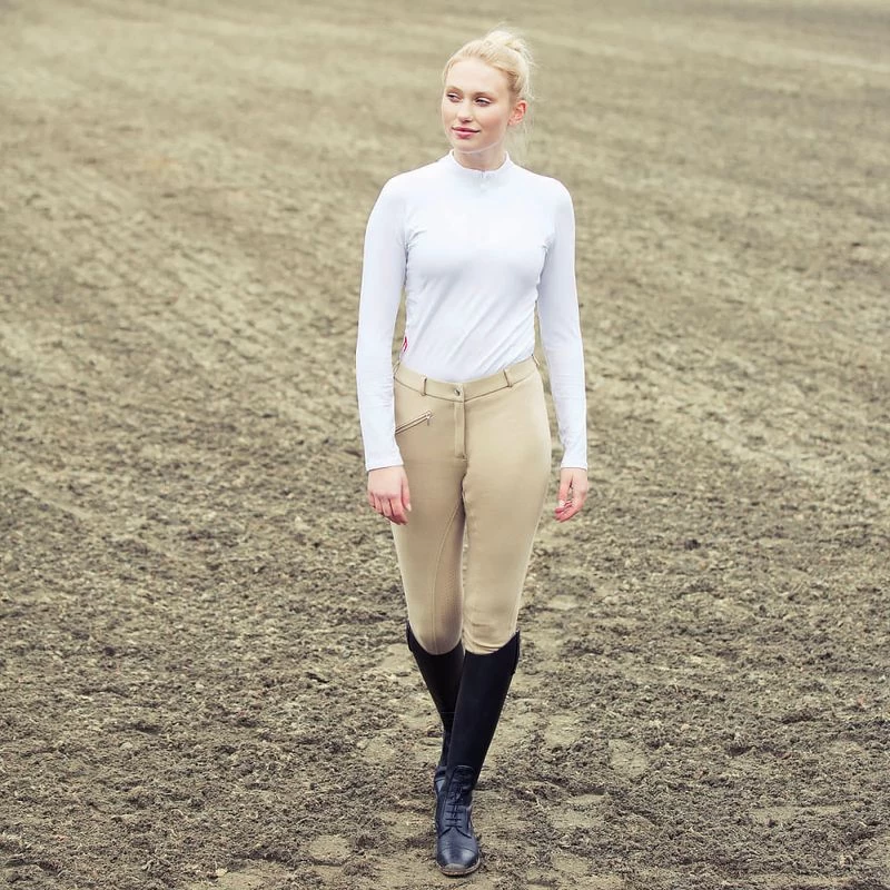 Horze Active Womens Knee Patch Breeches feature a jersey-feel fabric that gives these breeches soft comfort. These riding pants are a nice choice when you don’t want the formality of other high-end breeches. The soft fabric is warm and breathable and ideal for afternoon rides around the stable or on long trail rides. The simple zipper pocket in the front will hold a single horse treat for rewarding a nice ride. You will love the comfort of these pretty breeches.