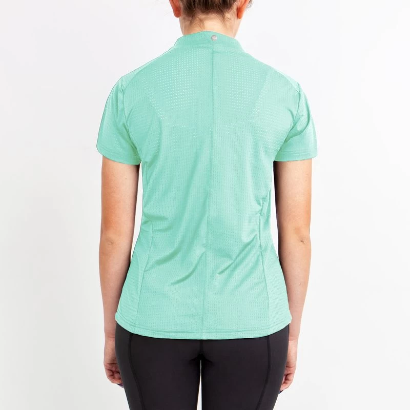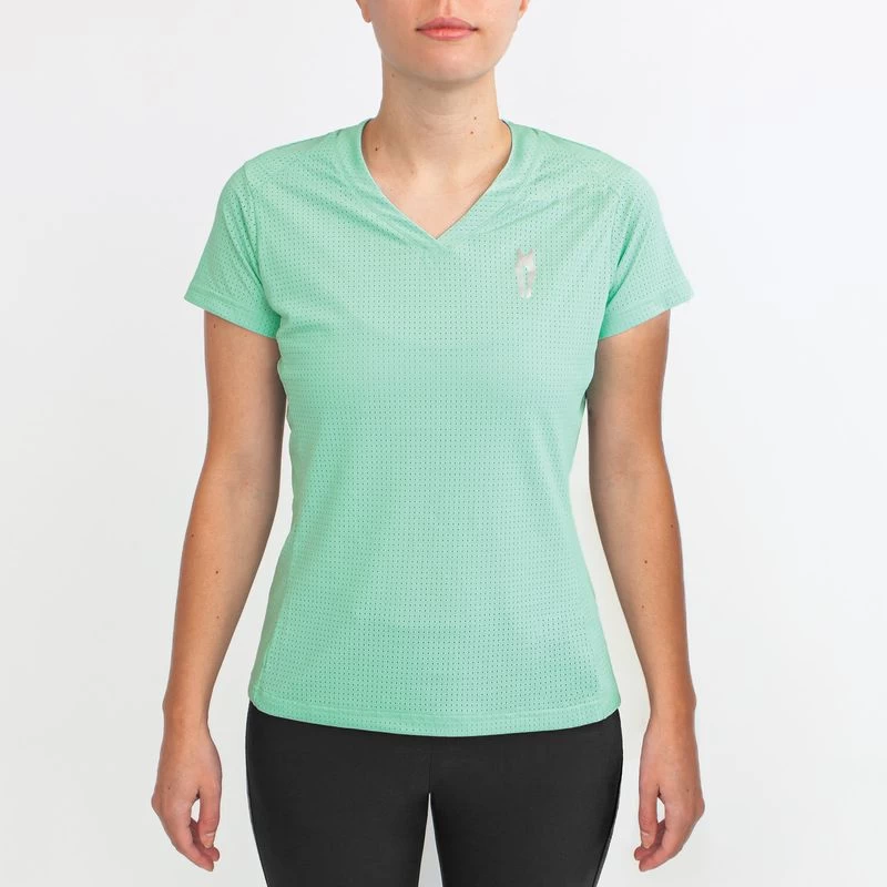 This tee shirt style tech shirt is made of high stretch IceMesh fabric that is breathable, moisture wicking, smooth and cool to the touch. It has a feminine sculpted neck line and a fitted silhouette.