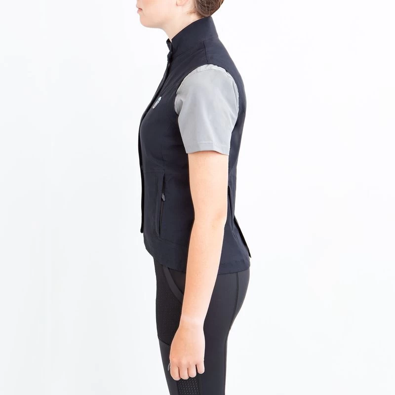 This lightweight, comfortable vest is made of a moisture wicking and quick drying stretch woven fabric. It has zip and snap closed front for extra durability, and an elliptical hem for coverage in the saddle.