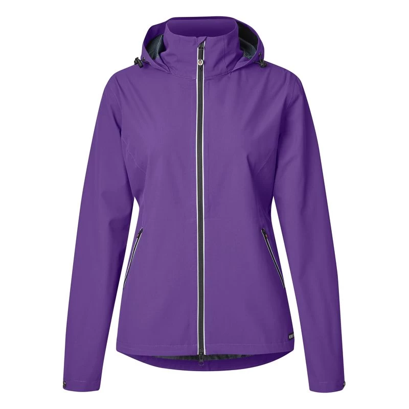 Made for riding, its lightweight and stretchy with pit zips to unzip if a horse takes splashing as an invitation to elevate. Cinch up the drawcord, or wear at hip length and enjoy the double front zip for in-saddle performance. Reflective tape lets others see riders coming through the mist. Stowable hood, two zip pockets.