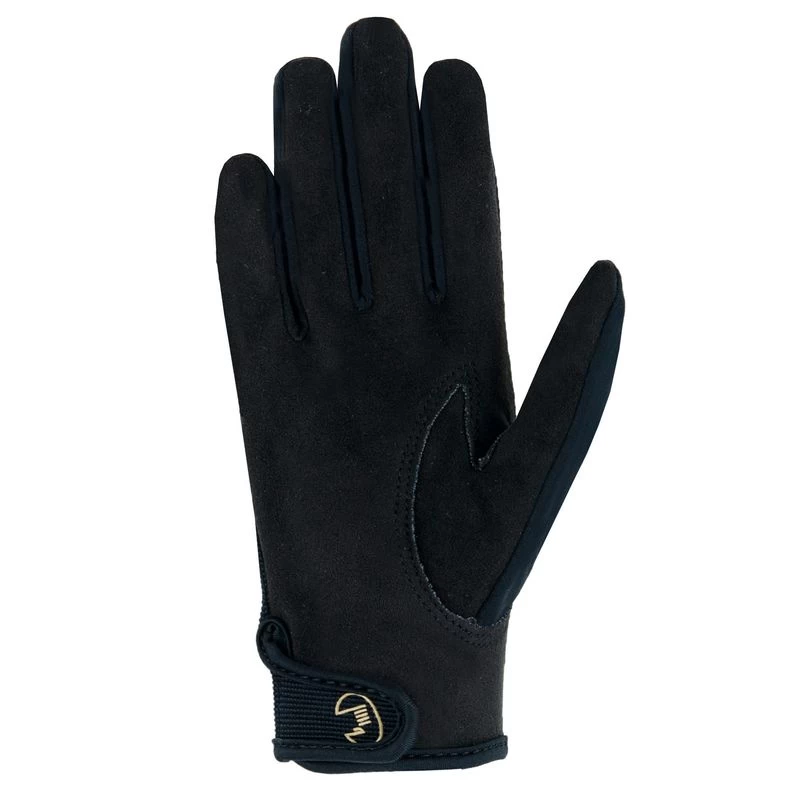 Hard-wearing Durasense synthetic suede on the palm gives extra grip to small hands. Easy closure cuff and glitter print horse and logo accent.